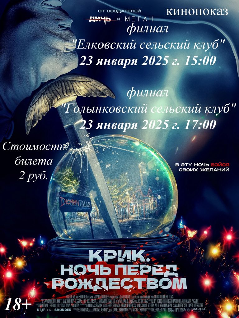 23 ЯНВАРЯ 2025 Г. В ФИЛИАЛАХ «ЕЛКОВСКИЙ СЕЛЬСКИЙ КЛУБ» И «ГОЛЫНКОВСКИЙ СЕЛЬСКИЙ КЛУБ» СОСТОИТСЯ ПОКАЗ ФИЛЬМА «КРИК. НОЧЬ ПЕРЕД РОЖДЕСТВОМ» 21.01.2025 Киновидеообслуживание агрогородков Оставить комментарий