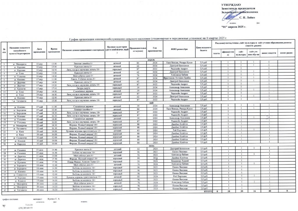 График организации киновидеообслуживания сельского населения на II квартал 2025 г. 01.04.2025 Киновидеообслуживание агрогородков Оставить комментарий