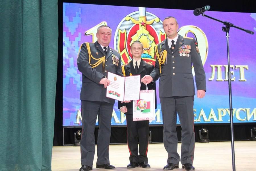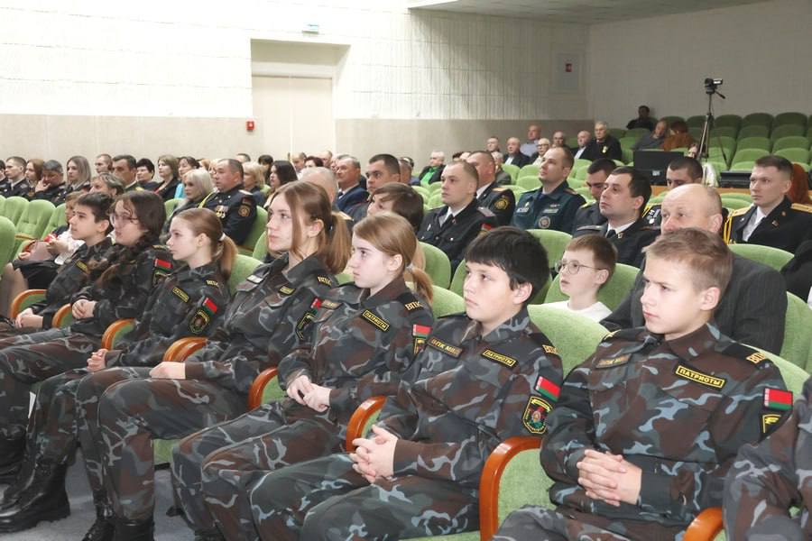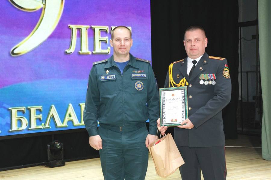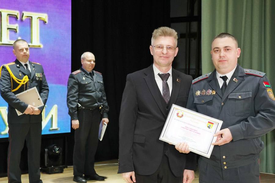 Сотрудники РОВД, ветераны службы и воспитанники военно-патриотического клуба принимали поздравления от начальника отдела Владимира Святохи и председателя райисполкома Юрия Костоломова.